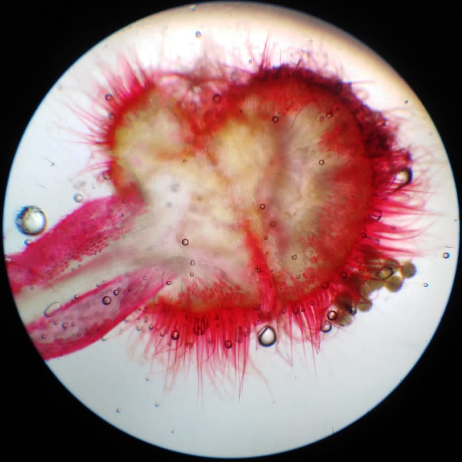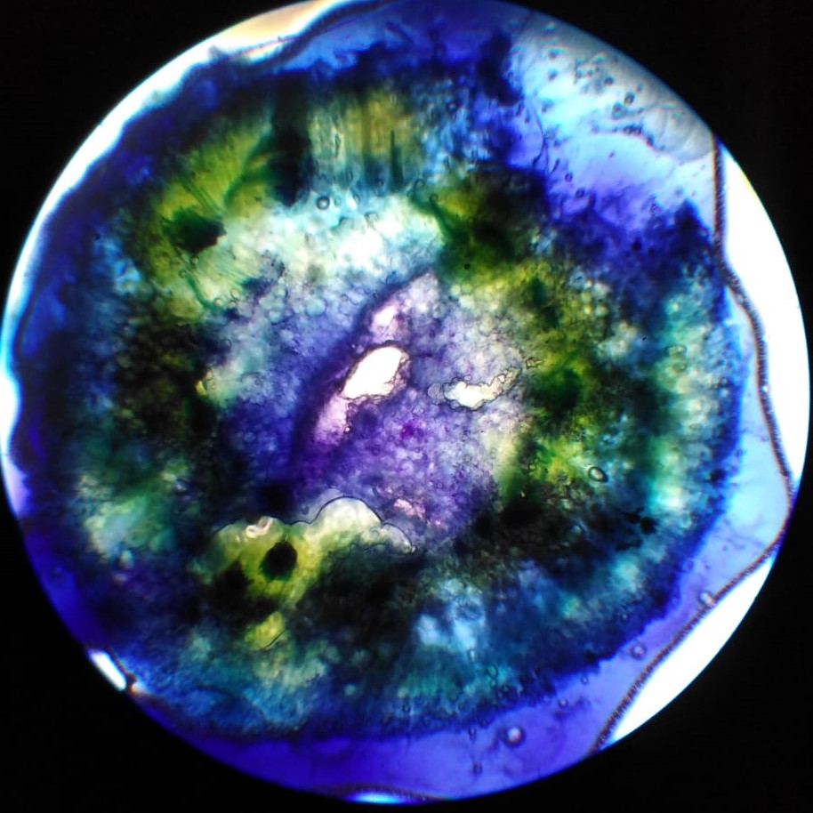 Yet again, the lenses of the microscope open up new universes to be revealed to Dorra – and to myself – of what those plants carry beyond the surface. Adding on to the vibrant colors of the flowers, Dorra used a Methylene blue staining experiment on some of them. Methylene blue stain is a simple stain where a single dye is used to emphasize particular structures in the sample, shape (the size and arrangement of bacteria) (source: microbiologie-clinique.com). The blue dye filled in one of the microscopic images and created what looked – to me – like a planet from a magical galaxy.