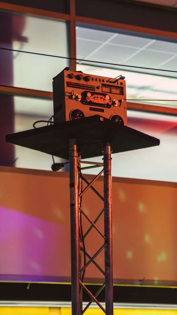 I was moving in the Stationskwartier first-floor space with all ears concentrated on the different soundscapes, three different rhythms come out and are heard out together simultaneously at the same time. Creating polyrhythms in the space, Martijn de Geele has composed music in 3 different layers that repeat in a cycle of 3 minutes, 6 minutes, and 9 minutes. The shorter tape loops have 3, the medium length ones 6, and a longer one on the stand of 9 minutes. “This effect of different lengths will make the machines dance around each other and synchronize over time.” I am not really sure what he means by that. “So the sound is similar, but every space has different acoustics that will make it sound different again too.”