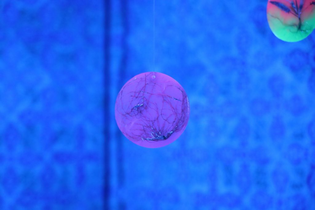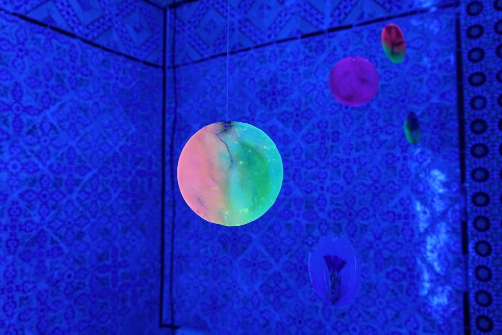 The collected material was placed in small moulds reminiscent of petri dishes and filled with epoxy resin. In some cases, fluorescent colour was added to the epoxy resin, creating an incredible effect. The plant parts hardly seem natural any more or as if they were actually in the resin. It creates more of an x-ray impression. Shatha Khalifeh planned to continue these workflows in Tunis and to create different effects with the help of light sources and arrangements in her exhibition room. When she arrived in Tunis, not all the materials she needed to continue where she left off in Amman were provided. With the support of helping hands from the artists’ accomplices and the production team, a compromise was created that would not only correspond to Shatha Khalifeh’s concept, but also arrange itself to the conditions of the space.